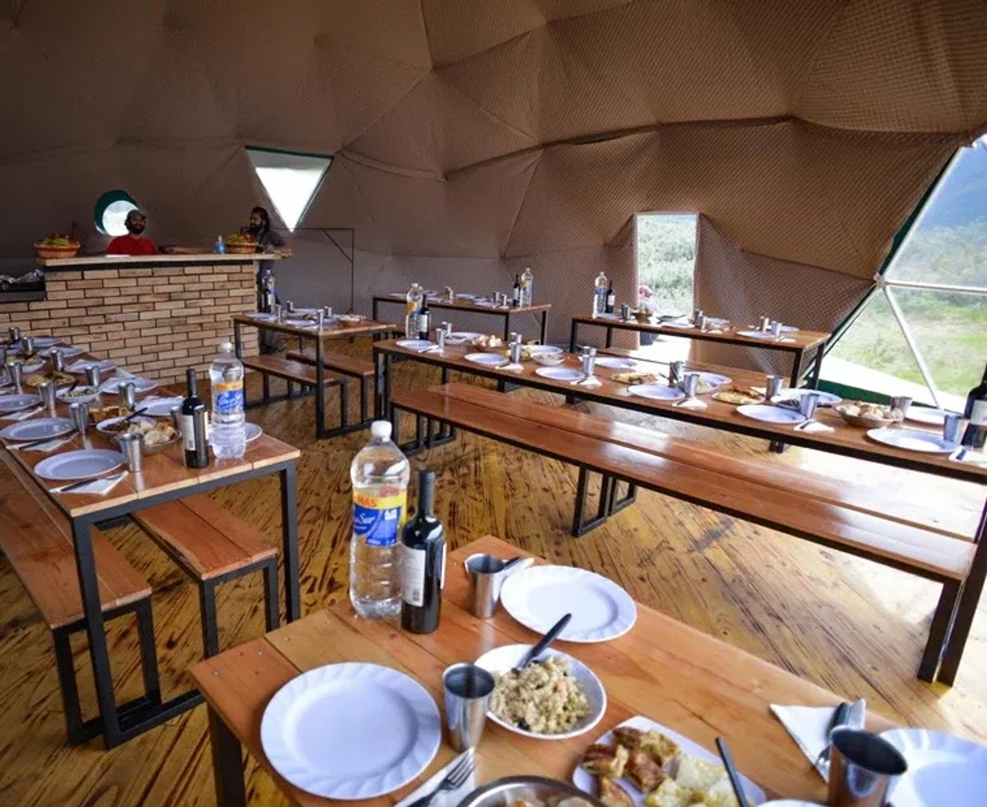 Arribo al Río Lapataia y Almuerzo. En un sitio panorámico y alejado del tumulto del turismo convencional, en un refugio calefaccionado, cómodo y muy amplio ¡llega el almuerzo! El plato principal es pechuga rellena de panceta y puerro acompañada de verduras asadas. Postre. Vino, gaseosas, agua. Café, té. Ofrecemos menús para vegetarianos y celíacos con reserva previa.