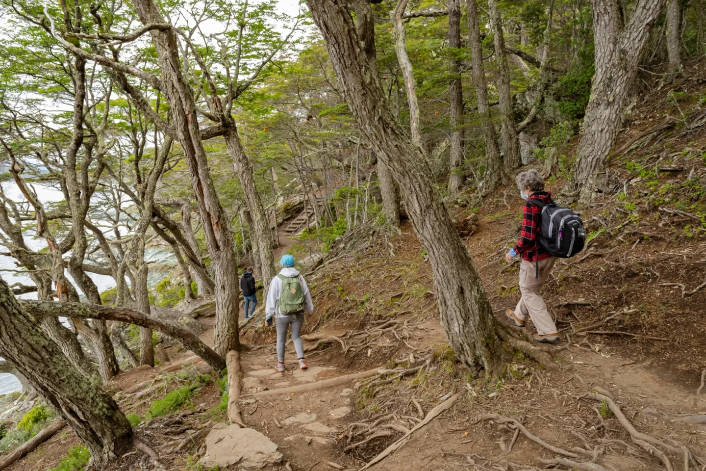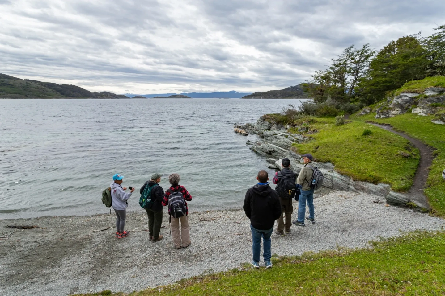 Arribo a PN, Pago del ingreso al Parque Nacional (no incluido) y llegamos a Bahía Ensenada frente a la isla Redonda, donde está la estafeta postal del fin del mundo. Los 8 km de terreno ondulado, de dificultad media, de la Senda Costera, no representa un desafío a los aficionados al ejercicio con la indumentaria adecuada. Costa marina y bosque: durante algo más de 3 horas, el guía se luce con mucha información que ameniza y amplifica enormemente la experiencia.