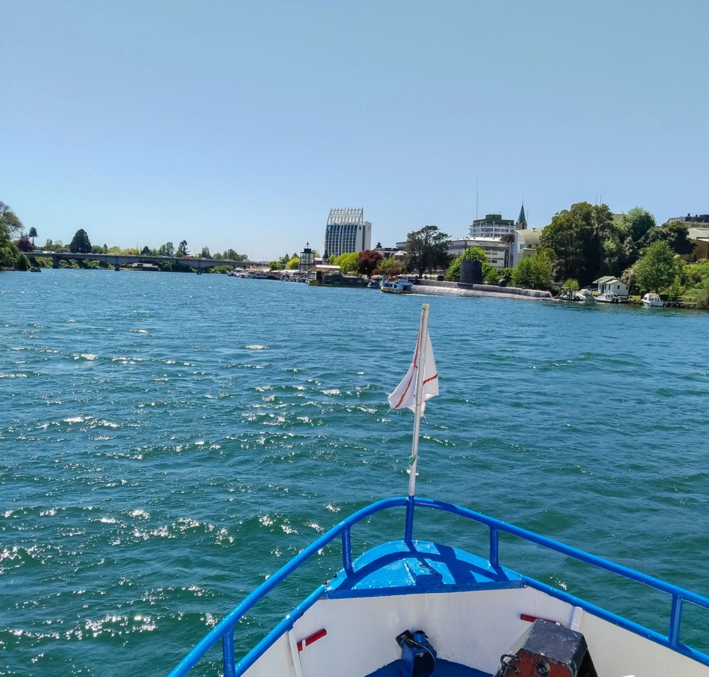 Inicio de la navegación por los ríos de Valdivia con vistas panorámicas.
