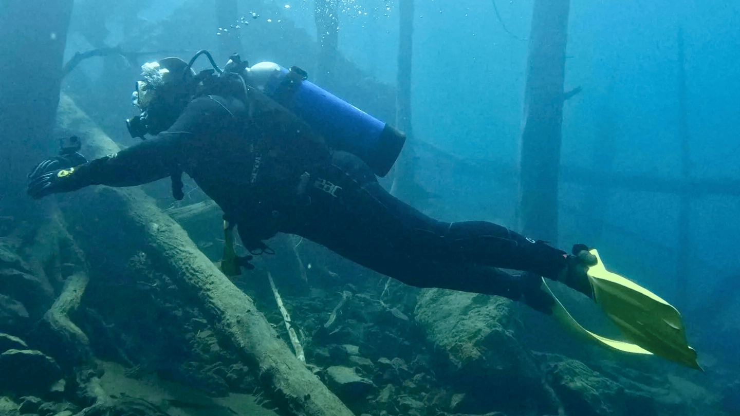 Una vez finalizada la preparación, comienza la inmersión en las aguas del lago para explorar un paredón submarino en la península Quetrihue. Durante el recorrido subacuático, los participantes atraviesan un laberinto de árboles caídos y pueden observar crustáceos, truchas y otros elementos del ecosistema local en un entorno de gran claridad y belleza natural.